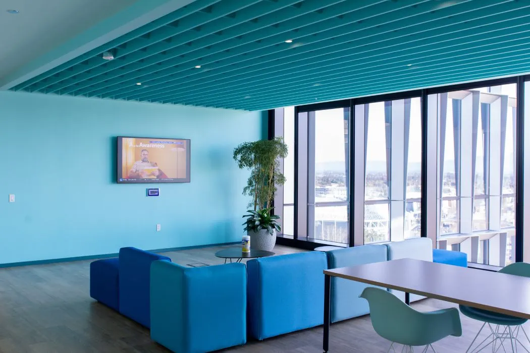 This 1,300,000 square foot, 18-story project features a multi-story all-hands assembly space, a customer experience center, café, and flexible work floors. The all-hands space seats 300, and Magnum’s Ceiling Division delivered the two-story decorative acoustic fins that integrate theater lighting and specialized finishes. Across tens of thousands of square feet of acoustical wallcovering systems and custom ceiling finishes, Magnum’s crews produced some of the most striking interior spaces on the project. The 18th-floor executive level features AV graphics display areas, acoustical panel sound mitigation, and custom Armstrong ACGI wood and turf design felt fin ceiling systems — all executed by Magnum.