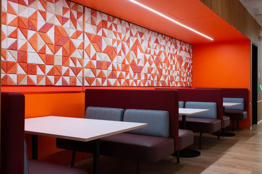 This 140,000 square foot building — over 25 years old at the time — underwent a complete remodel to achieve a contemporary, high-performance environment. The project incorporated more than 56,000 square feet of custom ceiling finishes, including acoustical ceilings using Armstrong materials, 9-Wood ceiling assemblies, felt Arktura ceilings, and metal ceilings. The ceiling selections were carefully coordinated with the wallcoverings and panels throughout, resulting in a cohesive and visually compelling interior.